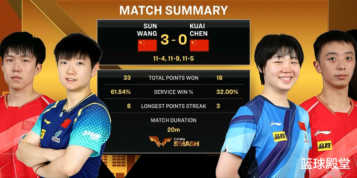 这场比赛来看,王楚钦/孙颖莎就是实力上的压制。一方面他们两个配合非常久,还有一方面个人技术方面就是保持压制。就整个过程来看,打得还是太顺利了。可能第二局比分看起来激烈,只要及时调整,他们还是可以轻松完成逆转,全场比赛就打了20分钟。从目前的状态发挥来说,王楚钦/孙颖莎肯定会冲刺最后的冠军。
