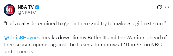 谈到巴特勒,名记Chris Haynes在节目中表示:库里仍然保持着高水平的竞技状态。我和一位与巴特勒关系非常密切的人聊过,他说巴特勒对待这个休赛期的态度,就像他即将进入新秀赛季一样,他确实下了很大决心,要全力以赴带领这支勇士冲击总冠军;还有追梦格林,我依然认为他是联盟中最顶尖的防守球员之一,我知道这无法完全通过盖帽或抢断数据体现,但他在身体对抗上确实做到了。