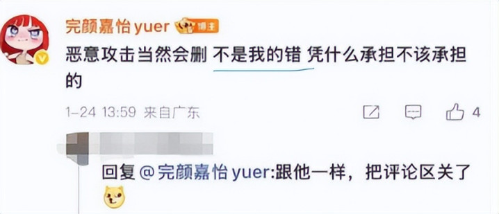 她不仅出面删除了相关的恶评,还直接放话不是自己的错,进行了分割。