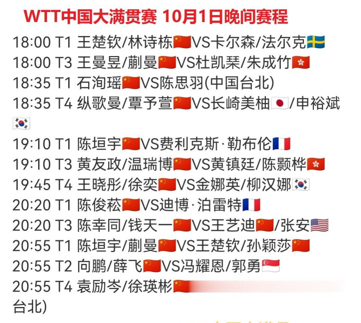 WTT中国大满贯2025年10月1日晚间国乒赛程,如上图所示。