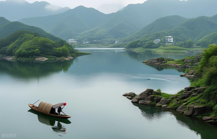 沃洲湖水面稳,岸上有塔,船在中间慢慢划,风一吹,烦心事散一半。